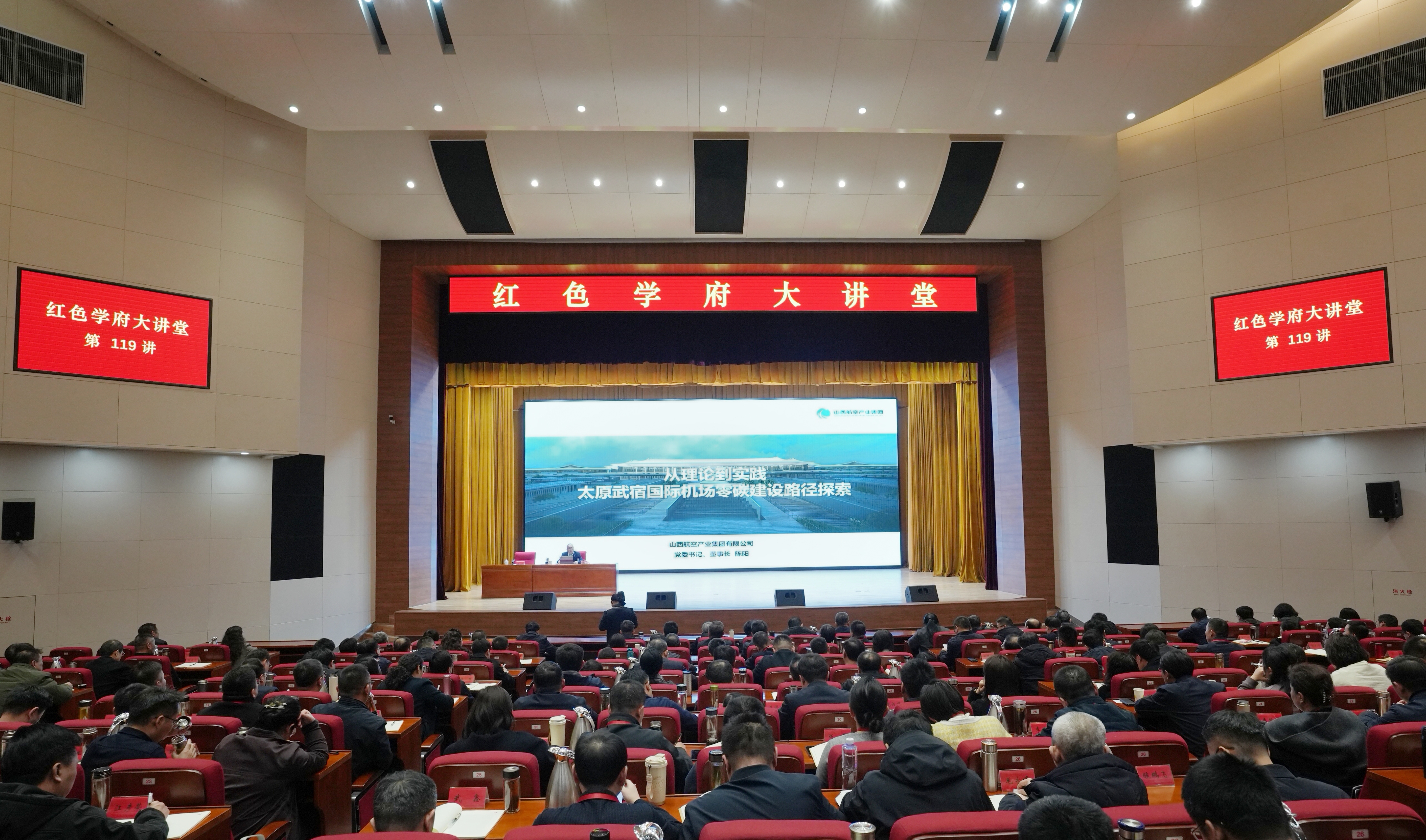 3月6日,山西航产集团党委书记、董事长陈阳应邀在省委党校第119期“红色学府大讲堂”作专题授课。本次授课作为 2026年开班第一讲,聚焦“从理论到实践——太原武宿国际机场零碳建设路径探索”主题,系统阐述了零碳机场的建设背景、规划路径及示范效应,为我省推进绿色低碳发展提供理论支撑与实践参考。报告会由省委党校(山西行政学院)主持工作的副校(院)长骞进主持。