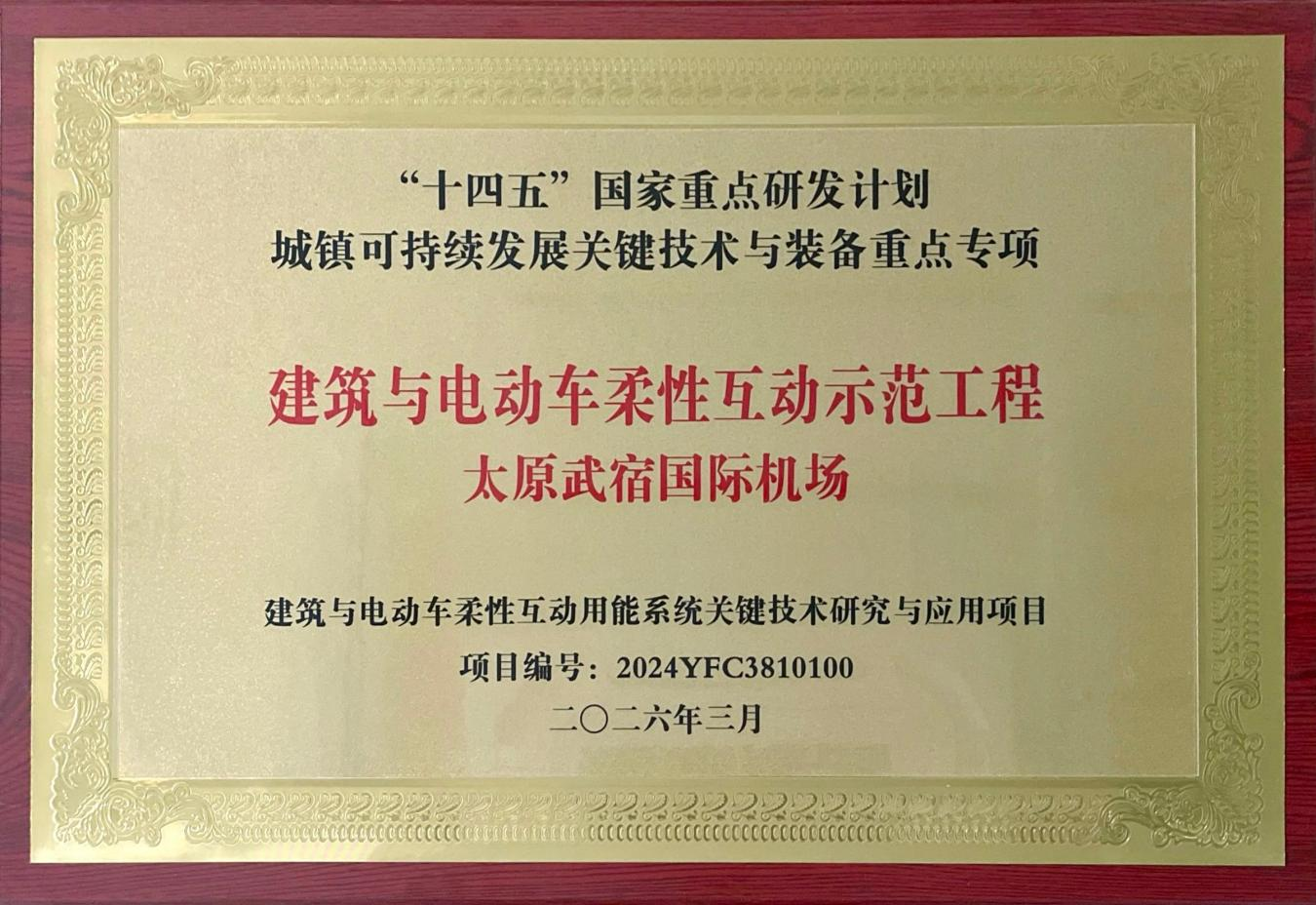 3月26日,作为学术周的重要议程之一,国家重点研发计划“城镇可持续发展关键技术与装备”重点专项项目示范工程实施方案论证会议召开。山西航产新能源有限公司党支部书记、董事长代表太原武宿零碳机场项目作汇报,并获授“建筑与电动车柔性互动示范工程”荣誉。这标志着该项目在建筑与交通能源系统协同、柔性互动用能等关键技术的集成应用与工程示范方面,正式纳入国家级科研项目重要实践序列。