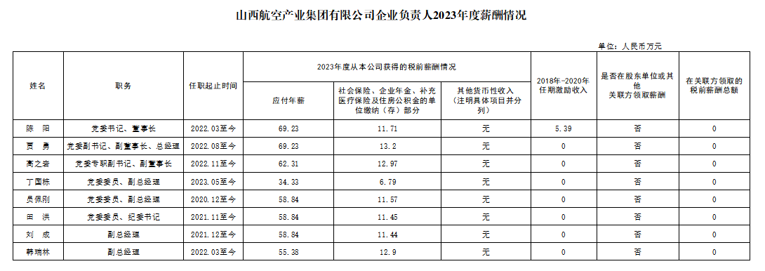 山西航空产业集团有限公司企业负责人2023年度薪酬情况